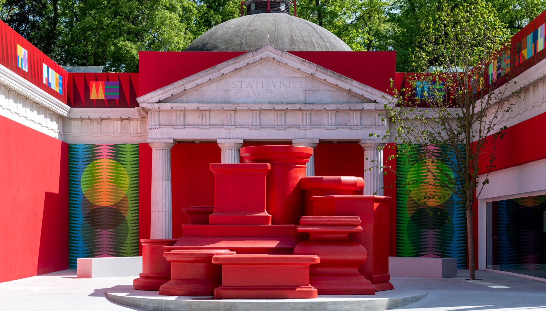 The United States Pavilion at the Giardini della Biennale, a building in the neoclassical style, opened on May 4, 1930. Since 1986, The U.S. Pavilion has been owned by the Solomon R. Guggenheim Foundation and managed by the Peggy Guggenheim Collection in Venice, which works closely with the Department of State and exhibition curators to install and maintain all official U.S. exhibitions presented in the Pavilion. Every two years, museum curators from across the U.S. detail their visions for the U.S. Pavilion in proposals that are reviewed by the NEA Federal Advisory Committee on International Exhibitions (FACIE), a group comprising curators, museum directors, and artists who then submit their recommendations to the U.S. Department of State’s Bureau of Educational and Cultural Affairs. Past exhibitions can be viewed on the Peggy Guggenheim Collection website.