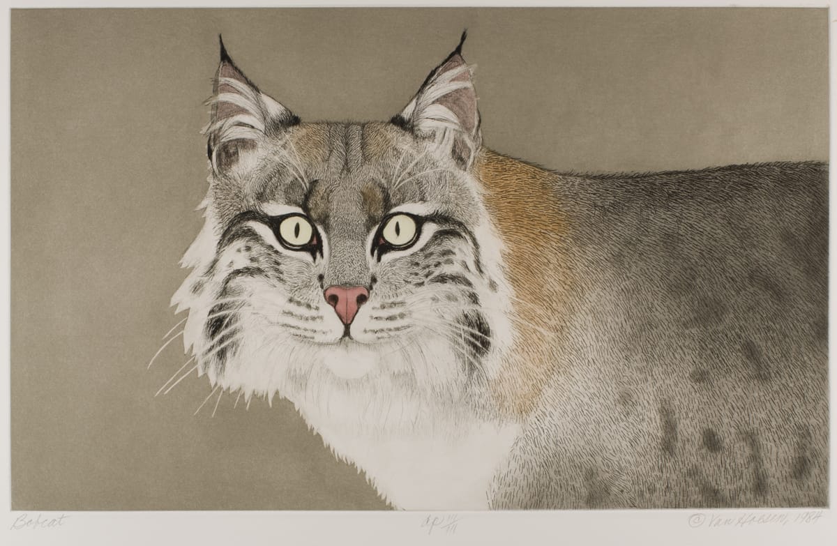 Beth Van Hoesen (American, 1926–2010). Bobcat, 1984. Color aquatint, etching, and drypoint with roulette, hand colored with watercolor on moderately thick, moderately textured white wove paper. Gift of the E. Mark Adams and Beth Van Hoesen Adams Trust, 2007.60.552 © Beth Van Hoesen
