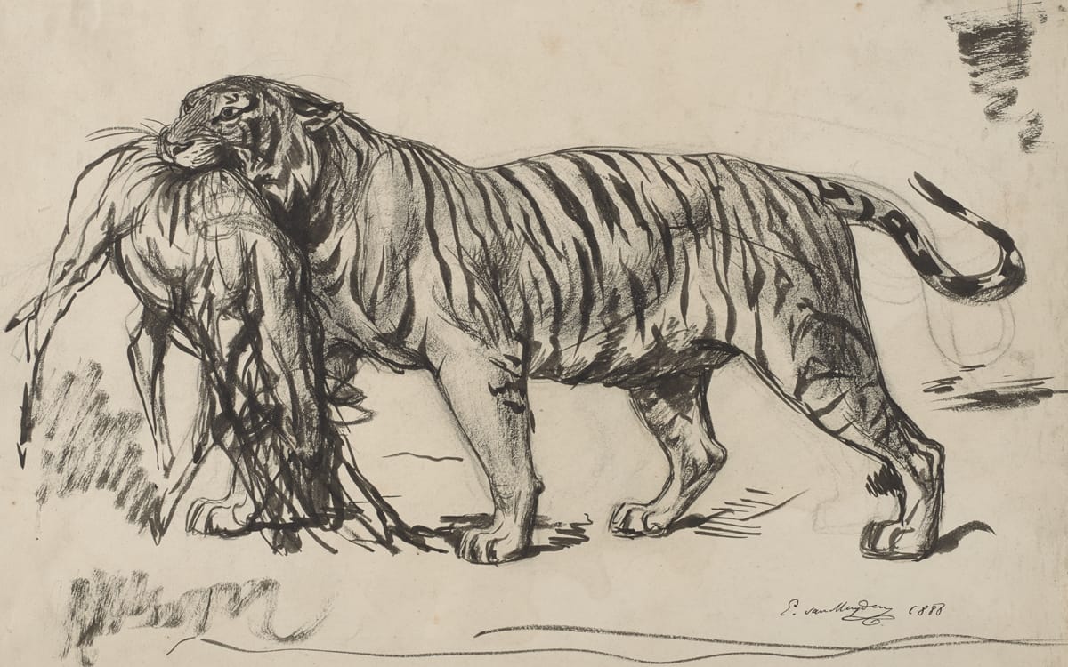 Evert van Muyden (Swiss, born Italy, 1853-1922), Tiger and Prey, 1886, ink and charcoal on cream wove paper, image: 11 1/16 in x 17 5/16 in; sheet: 11 1/16 in x 17 5/16 in, Bequest of Winslow B. Ayer. Portland Art Museum, Portland, Oregon, 35.92
