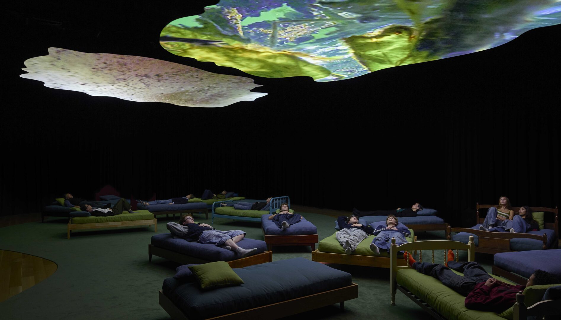 Rist creates conditions for visitors to come together in unconventional ways so that we might better understand our relationships to one another, our own bodies, and nature. In the gallery, raft-like beds provide a place for us to rest and share social space as we watch the projection overhead. She asks: “What happens to our perceptions when we don’t have to stand or fight gravity?” The sensation of floating may evoke a sense of returning to an elemental state. For the artist, the work “describes the fantasy of [ourselves] being an organic plant . . . and simulates our dissolution into water, mud, slime, molecules and atoms.”